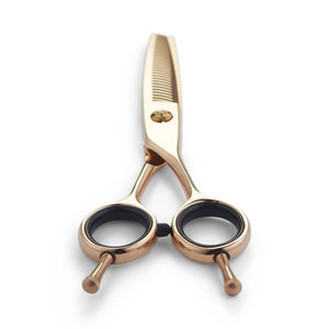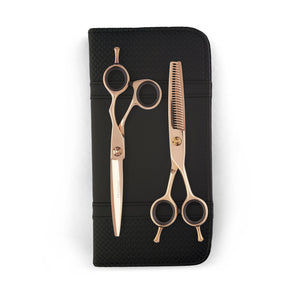 The elegant design of the Matsui Rose Gold Drop Handle Offset scissors features handles and premium steel that work together to create a lightweight feel, reducing wrist strain and minimizing the risk of RSI or carpal tunnel symptoms. These scissors are precision-engineered with a unique blade angle to ensure hair stays on the tips for smooth, effortless cutting. This design also keeps the blades feeling sharper for longer, making every cut a pleasure.